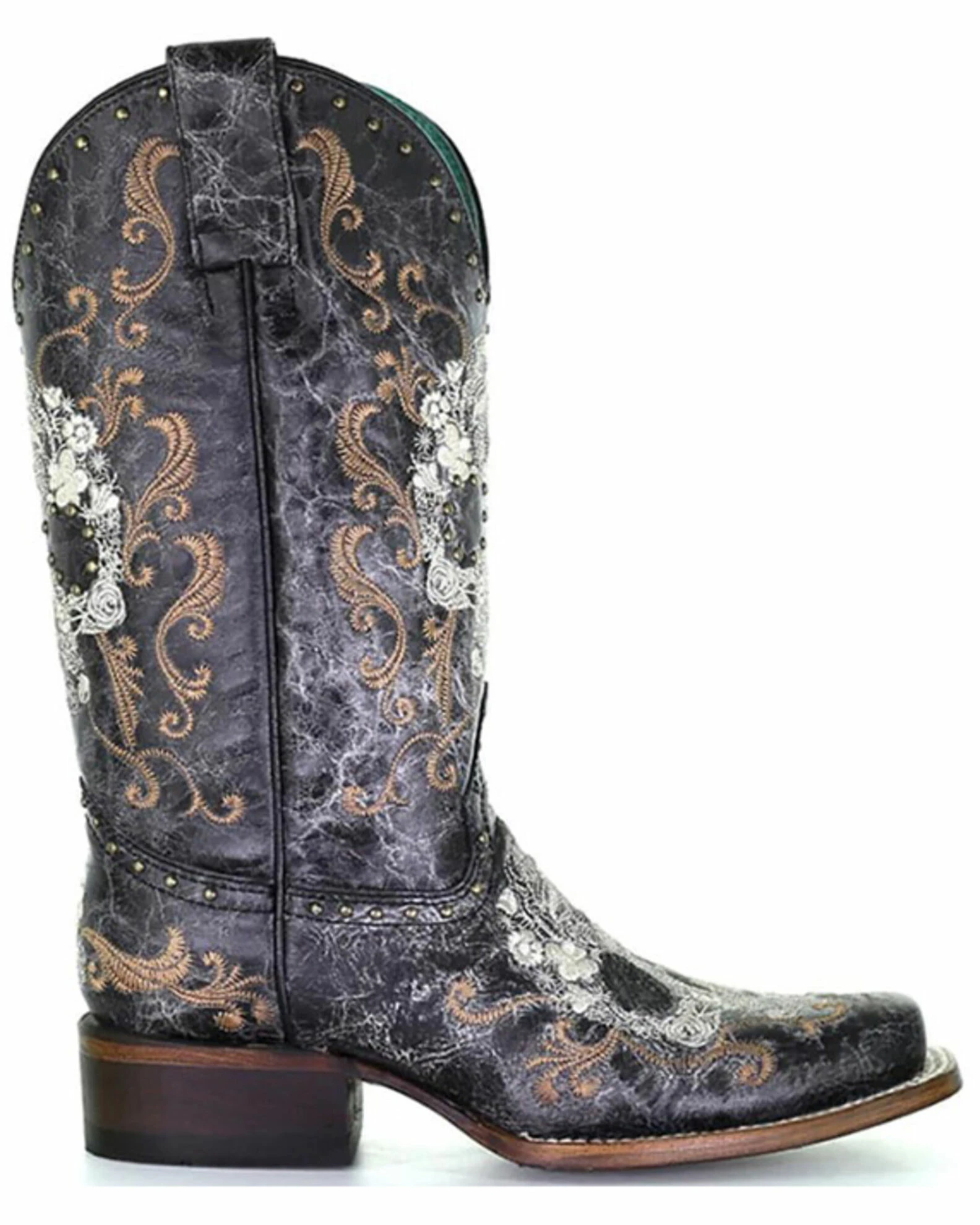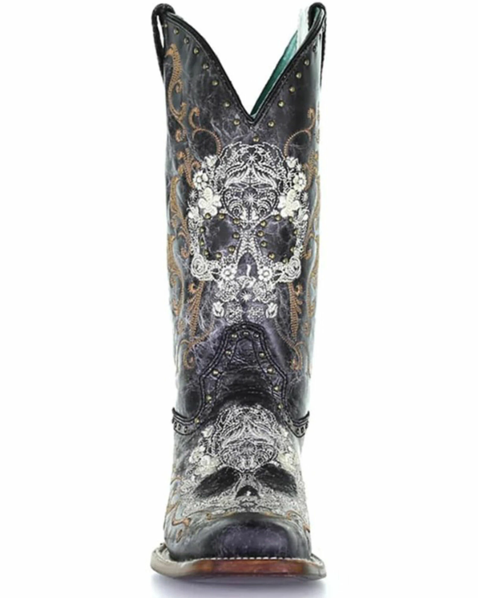 Corral Women’s Floral Skull Embroidery & Studs Western Boots – Square Toe Black/white