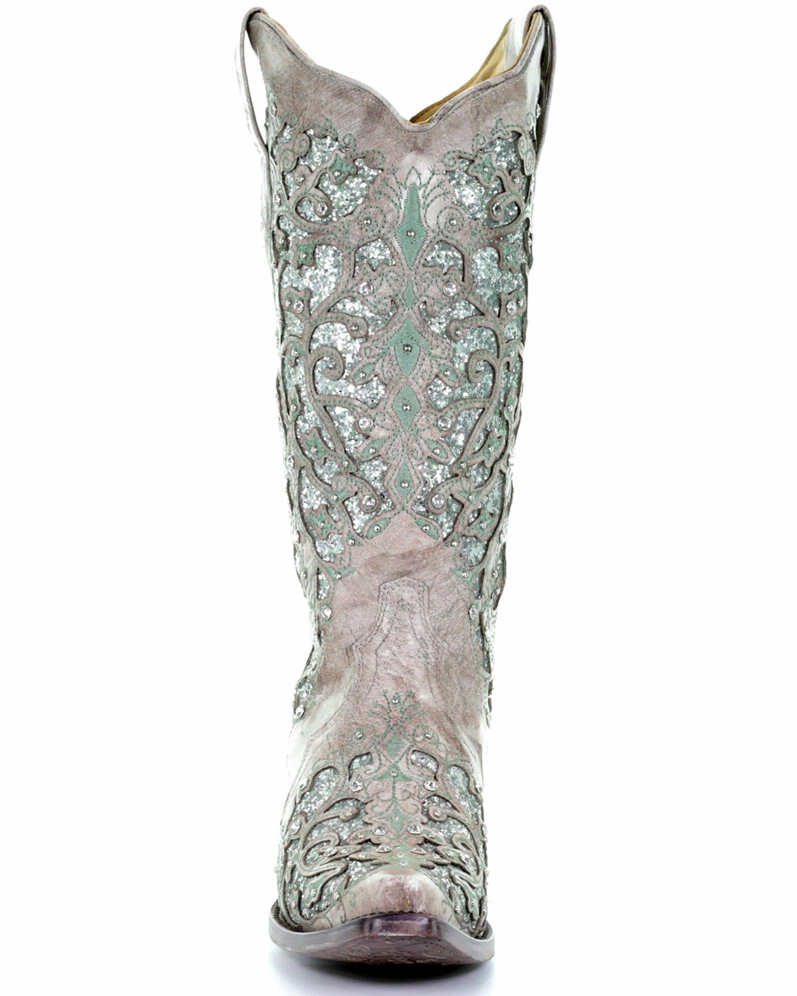 Show off your style in these Corral Glitter Inlay and Crystals Western Boots. These boots are decorated throughout with a gorgeous glitter inlay design with crystal accents. The snip toe and cowboy heel give these boots a traditional western feel. Wear them with jeans or a dress for the perfect statement making look.